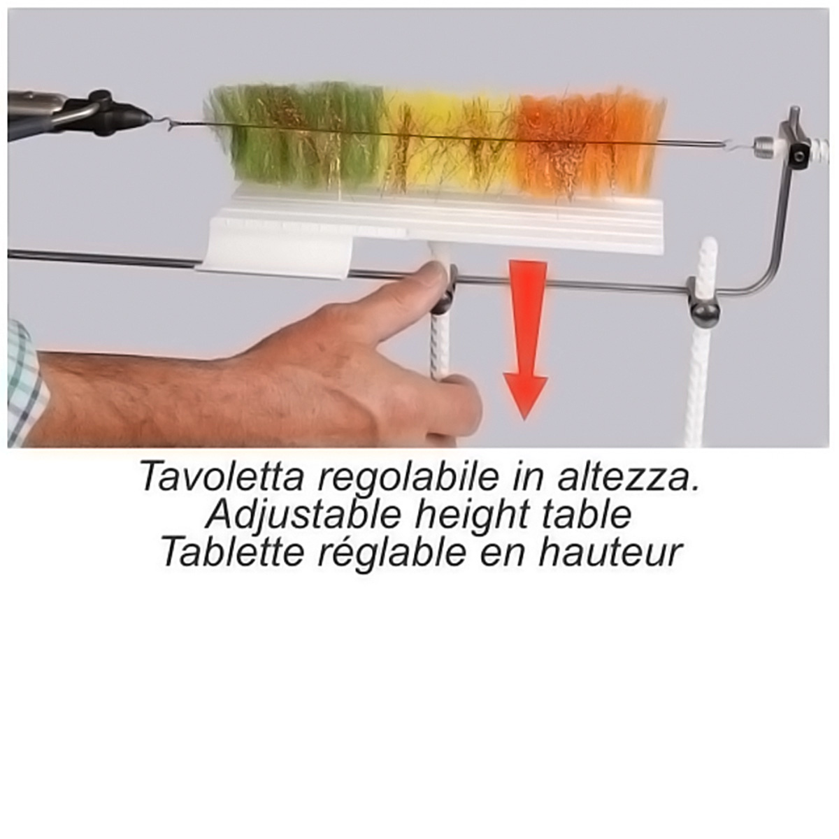Tillbehör för roterande skruvstäd, speciellt utformad för att göra dubbningsborstar på max 23 cm. Bordet, stadigt och med justerbar höjd, gör det enkelt att applicera olika typer av material på metalltråden. En speciell nisch underlättar en exakt skärning av dessa material till önskad längd.