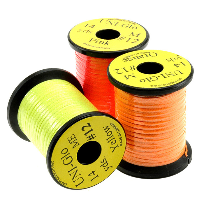 Piffa upp flugorna med en fosforescerande underdel eller tagg. UNI-Glo är ett platt, filmliknande material behandlat för att lysa i mörker. UNI-Glo är spolad som glitter och finns i fem färger. Ett kombinationspaket erbjuder fyra 14-yards spolar av varje färg.